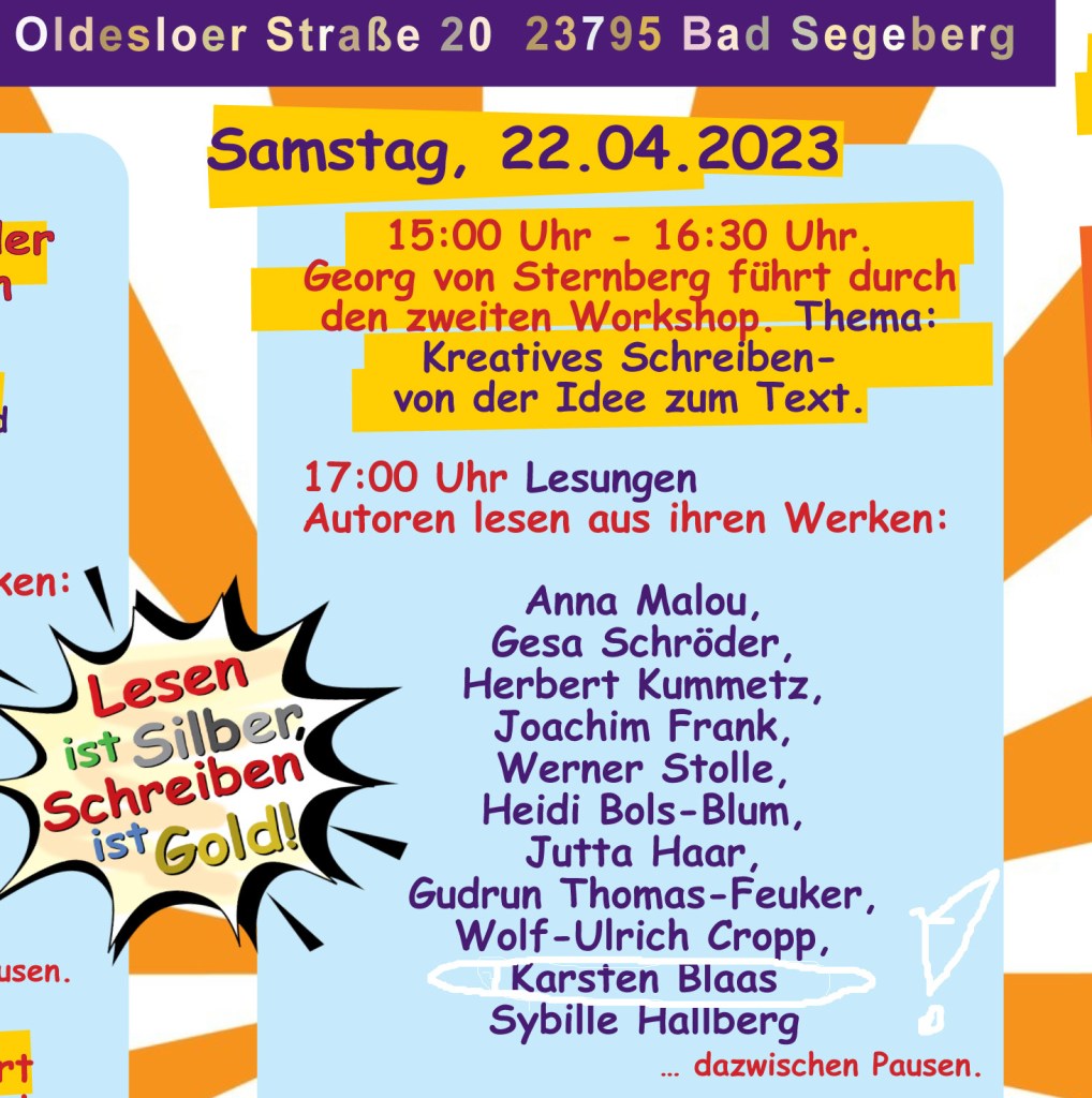 Am Sonnabend, 22. April, gastiere ich bei den Literaturtagen im schönen Bad Segeberg (im „WortOrt“), und es gibt als Welturaufführung einen Einblick in Nordstern #2 (das Manuskript ist ca. halb fertig, eine Veröffentlichung ist also noch weit entfernt, aber wer mal reinlauschen möchte, ist herzlich willkommen!)