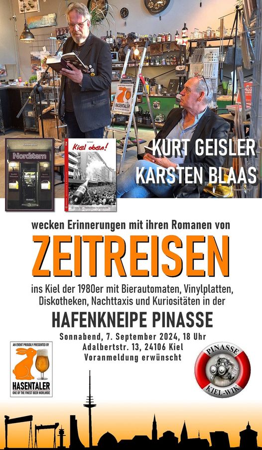 Am 7. September in der „Pinasse“ in Kiel-Wik: Kurt Geisler und ich hatten viel Spaß bei unserer Lesung inklusive Musik, Plattencover und fiktiver Bierwerbung. Danke an das tolle Publikum!